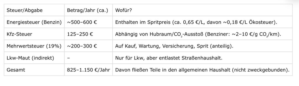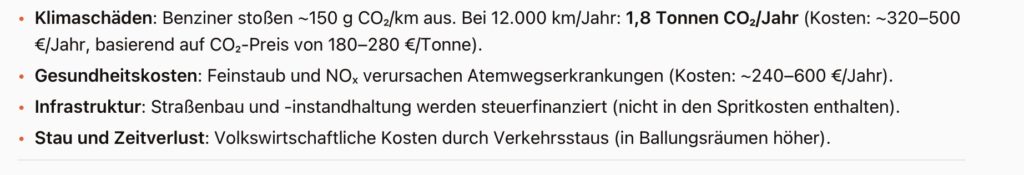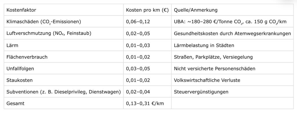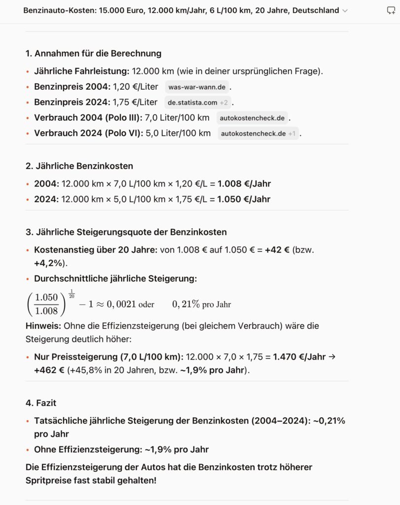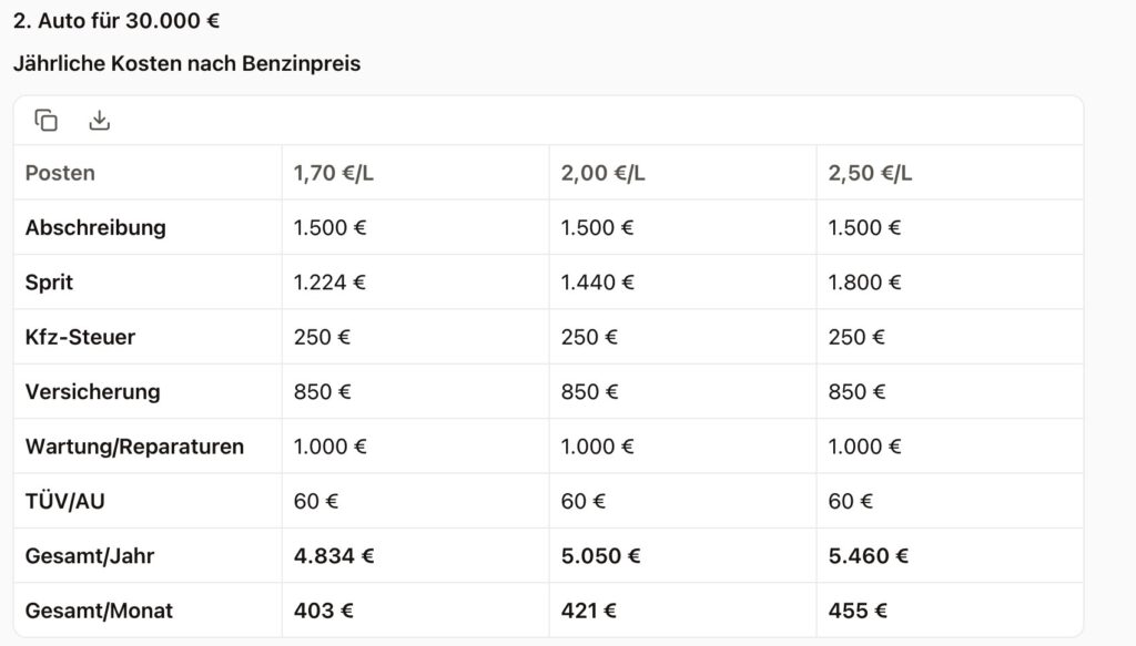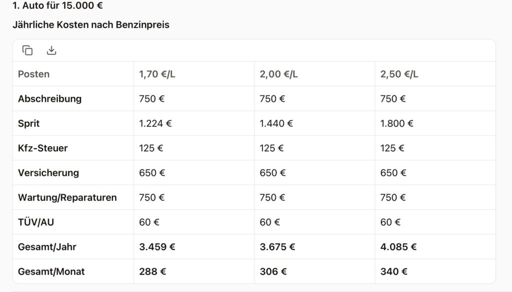 Aber mal ein paar Rechnungen zum Thema Auto, die ich mit Le Chat durchgerechnet habe. Was kostet so ein Auto überhaupt? Das heißt, wie viel Wohlstandsverlust ist es uns Wert ein Auto zu fahren?